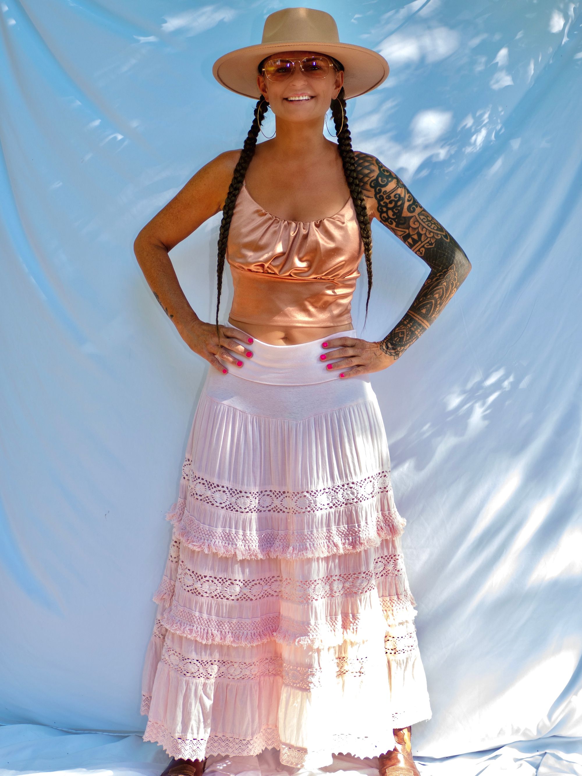 Upcycled, dip dyed light pink cotton skirt with lace details. Fits size M